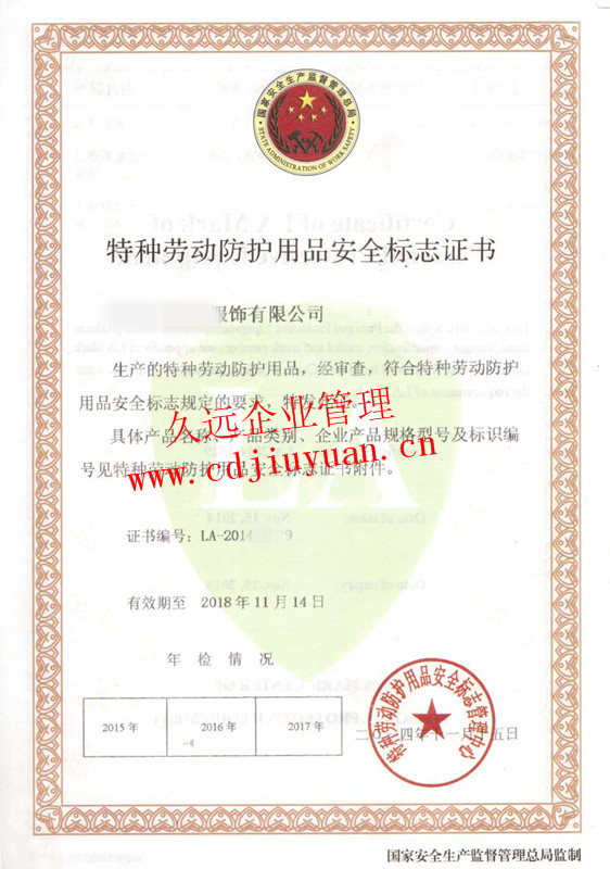 勞動(dòng)防護(hù)用品安全標(biāo)志認(rèn)證證書(shū)