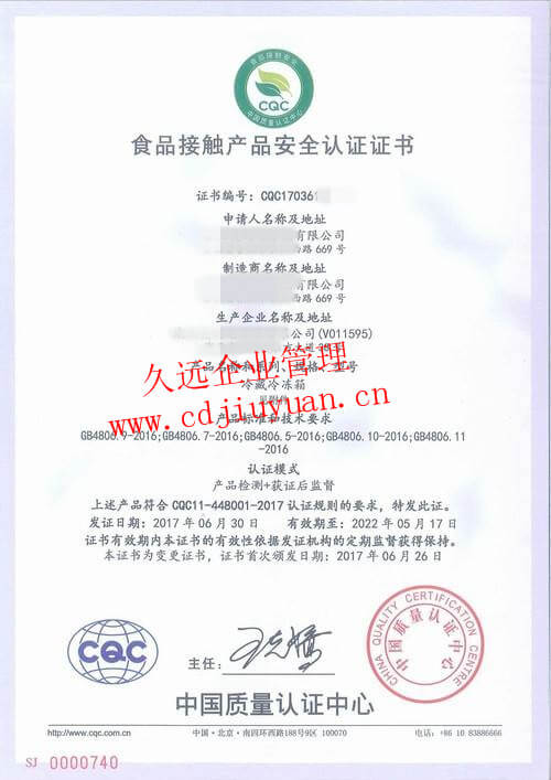 食品接觸產(chǎn)品安全認(rèn)證證書(shū)